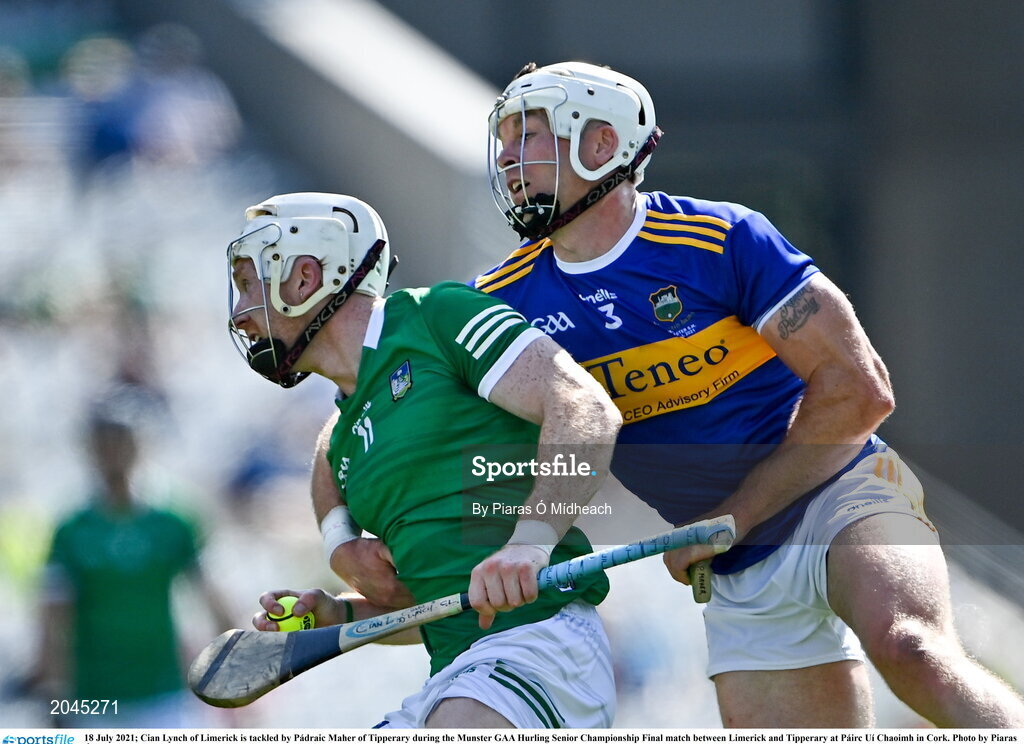 18 July 2021; Cian Lynch of Limerick is tackled by Pádraic Maher of Tipperary during the Munster GAA Hurling Senior Championship Final match between Limerick and Tipperary at Páirc Uí Chaoimh in Cork. Photo by Piaras Ó Mídheach/Sportsfile
