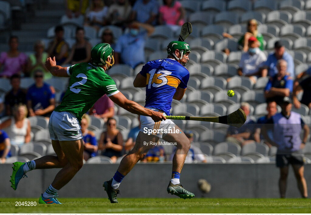 18 July 2021; John O'Dwyer of Tipperary shoots past Seán Finn of Limerick to score his side's second goal, in the 19th minute, during the Munster GAA Hurling Senior Championship Final match between Limerick and Tipperary at Páirc Uí Chaoimh in Cork. Photo by Ray McManus/Sportsfile
