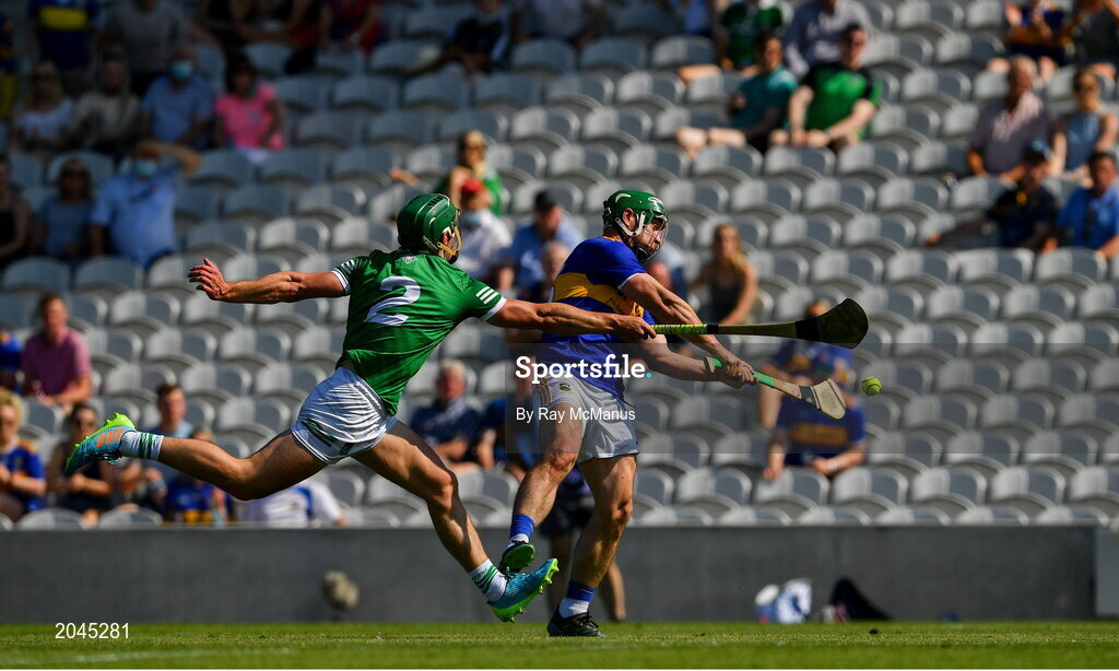 18 July 2021; John O'Dwyer of Tipperary shoots past Seán Finn of Limerick to score his side's second goal, in the 19th minute, during the Munster GAA Hurling Senior Championship Final match between Limerick and Tipperary at Páirc Uí Chaoimh in Cork. Photo by Ray McManus/Sportsfile