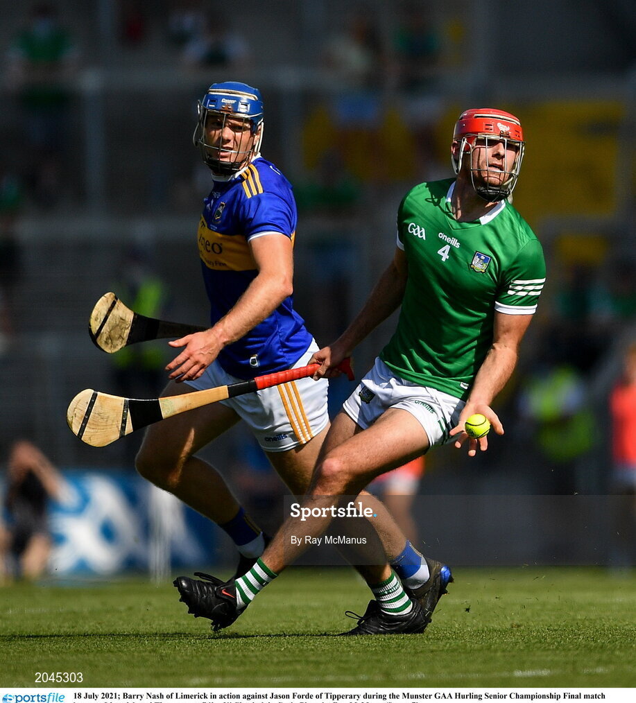 18 July 2021; Barry Nash of Limerick in action against Jason Forde of Tipperary during the Munster GAA Hurling Senior Championship Final match between Limerick and Tipperary at Páirc Uí Chaoimh in Cork. Photo by Ray McManus/Sportsfile
