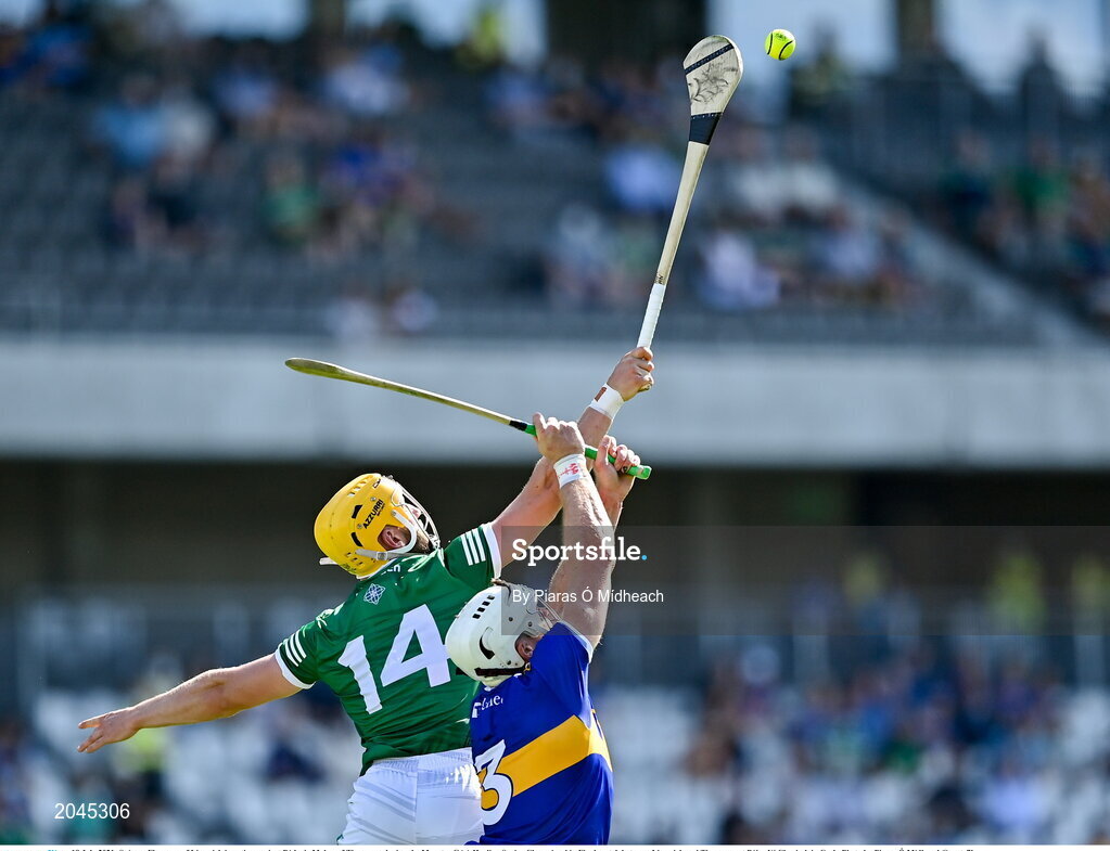 18 July 2021; Seámus Flanagan of Limerick in action against Pádraic Maher of Tipperary during the Munster GAA Hurling Senior Championship Final match between Limerick and Tipperary at Páirc Uí Chaoimh in Cork. Photo by Piaras Ó Mídheach/Sportsfile