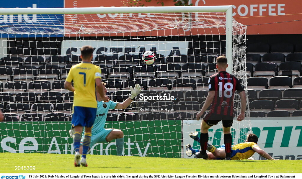 18 July 2021; Rob Manley of Longford Town heads to score his side's first goal during the SSE Airtricity League Premier Division match between Bohemians and Longford Town at Dalymount Park in Dublin. Photo by Michael P Ryan/Sportsfile