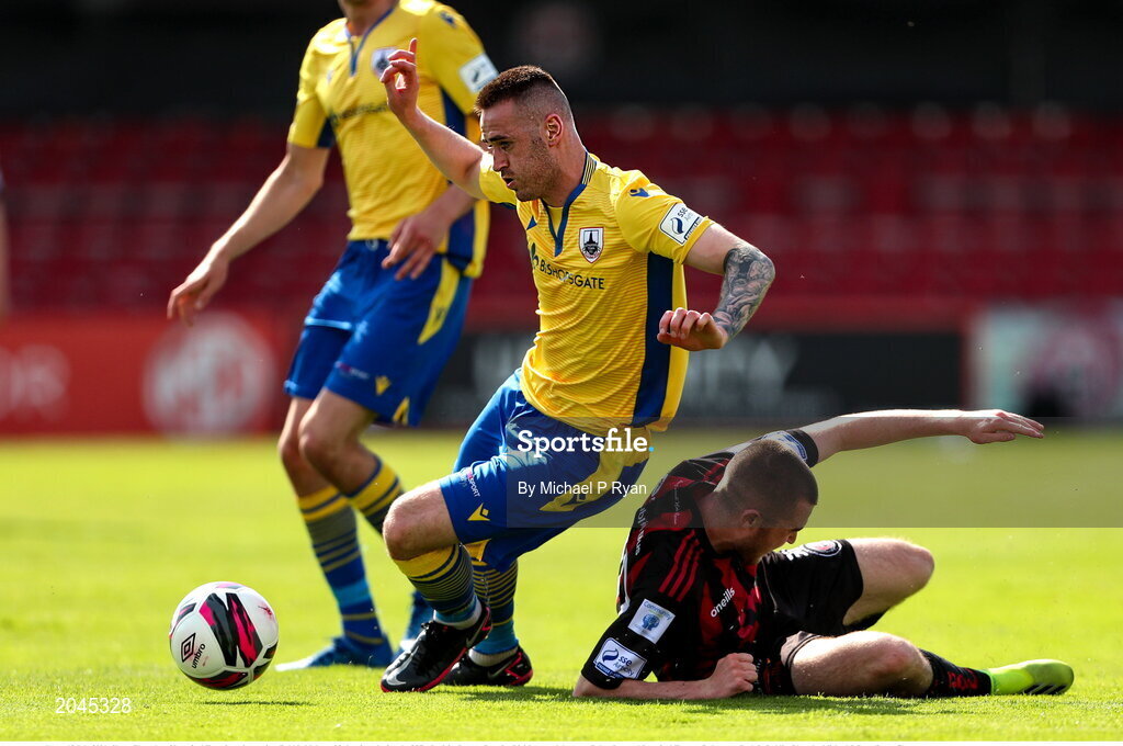 18 July 2021; Shane Elworthy of Longford Town in action against Robbie Mahon of Bohemians during the SSE Airtricity League Premier Division match between Bohemians and Longford Town at Dalymount Park in Dublin. Photo by Michael P Ryan/Sportsfile