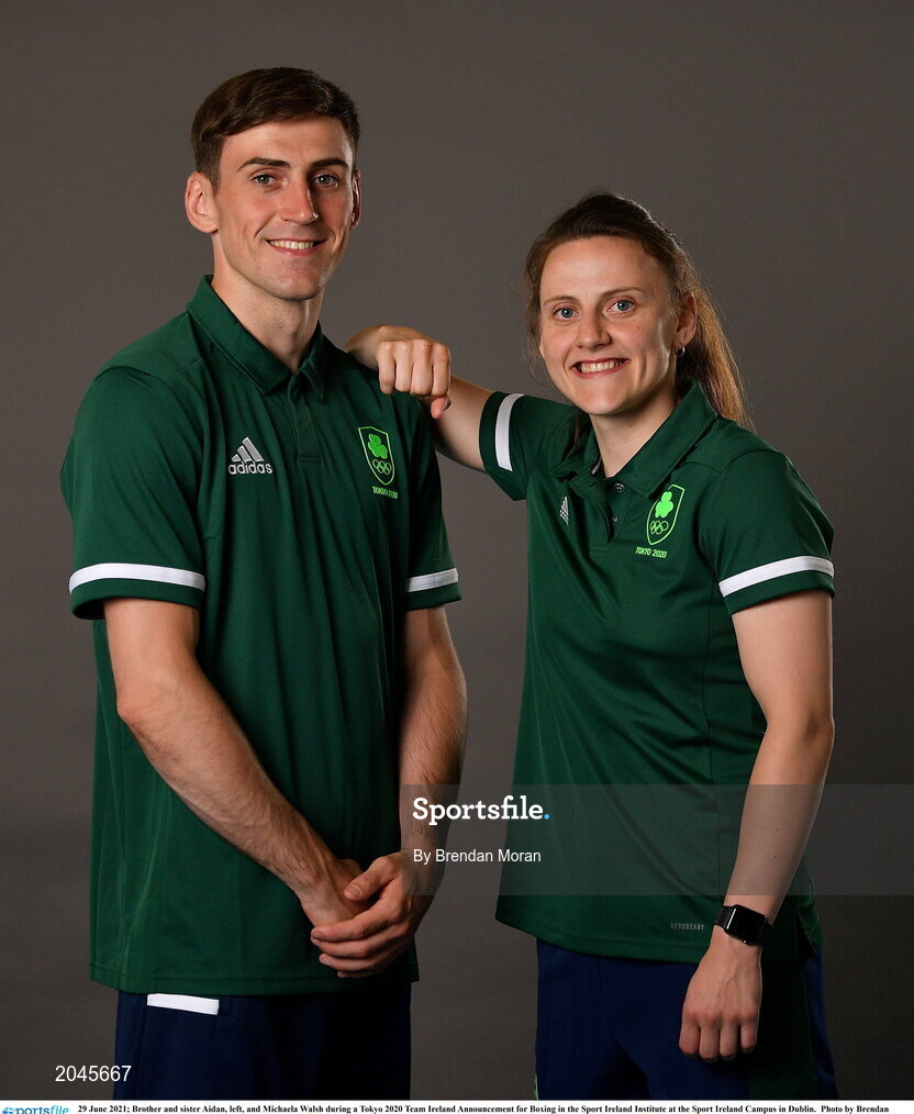 29 June 2021; Brother and sister Aidan, left, and Michaela Walsh during a Tokyo 2020 Team Ireland Announcement for Boxing in the Sport Ireland Institute at the Sport Ireland Campus in Dublin. Photo by Brendan Moran/Sportsfile