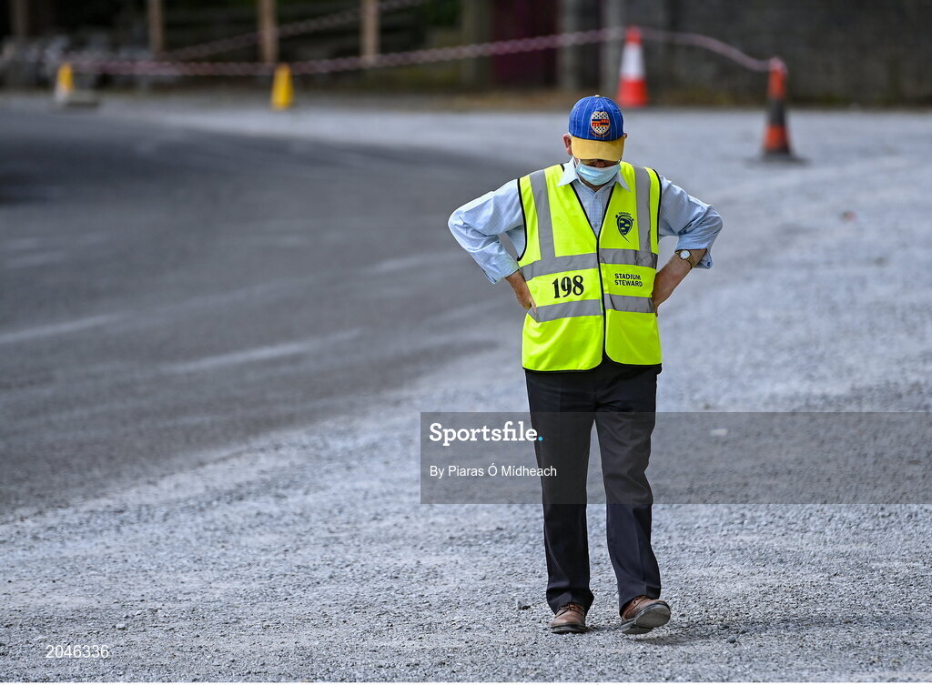 17 July 2021; A steward awaits the arrival of the Wexford team bus before the GAA Hurling All-Ireland Senior Championship Round 1 match between Clare and Wexford at Semple Stadium in Thurles, Tipperary. Photo by Piaras Ó Mídheach/Sportsfile