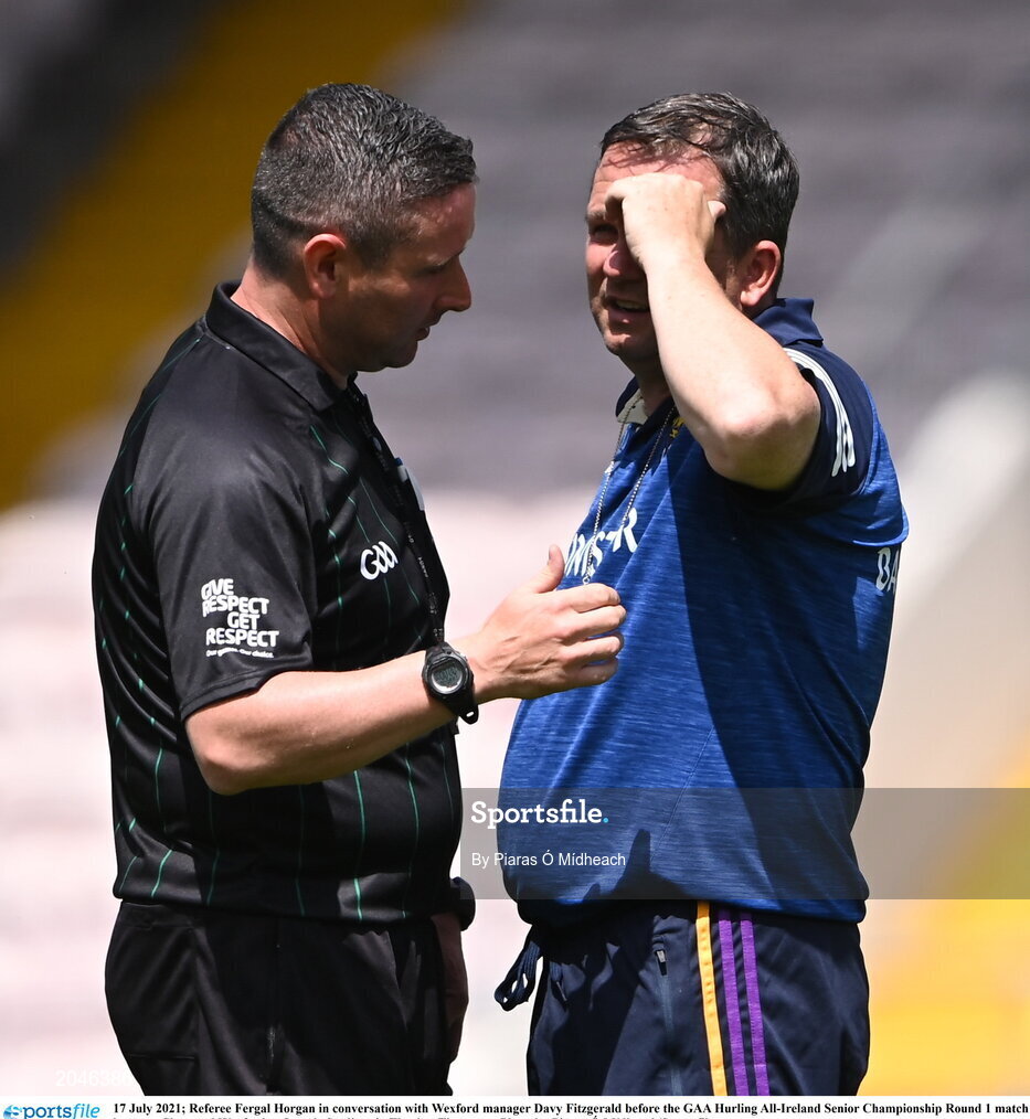 17 July 2021; Referee Fergal Horgan in conversation with Wexford manager Davy Fitzgerald before the GAA Hurling All-Ireland Senior Championship Round 1 match between Clare and Wexford at Semple Stadium in Thurles, Tipperary. Photo by Piaras Ó Mídheach/Sportsfile