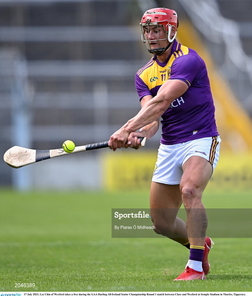 17 July 2021; Lee Chin of Wexford takes a free during the GAA Hurling All-Ireland Senior Championship Round 1 match between Clare and Wexford at Semple Stadium in Thurles, Tipperary. Photo by Piaras Ó Mídheach/Sportsfile