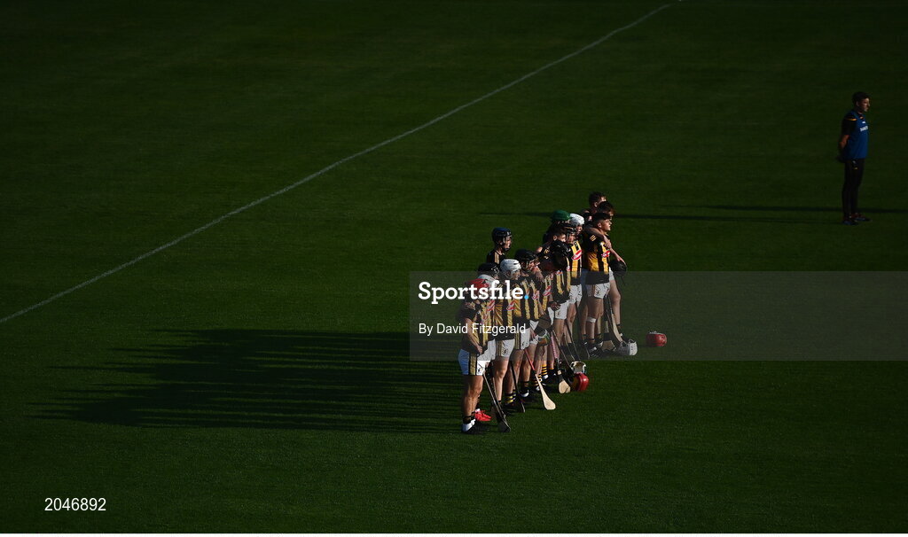20 July 2021; The Kilkenny team and manager Derek Lyng, top, stand for Amhrán na bhFiann prior to the Leinster GAA Hurling U20 Championship semi-final match between Kilkenny and Galway at Bord Na Mona O'Connor Park in Tullamore, Offaly. Photo by David Fitzgerald/Sportsfile