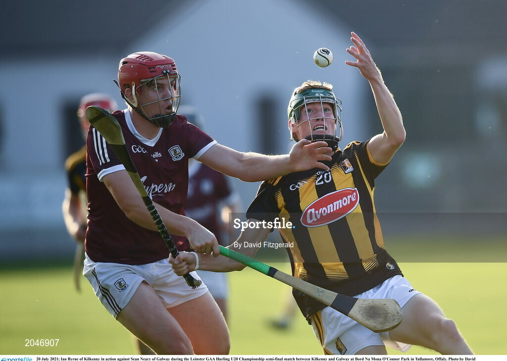20 July 2021; Ian Byrne of Kilkenny in action against Sean Neary of Galway during the Leinster GAA Hurling U20 Championship semi-final match between Kilkenny and Galway at Bord Na Mona O'Connor Park in Tullamore, Offaly. Photo by David Fitzgerald/Sportsfile