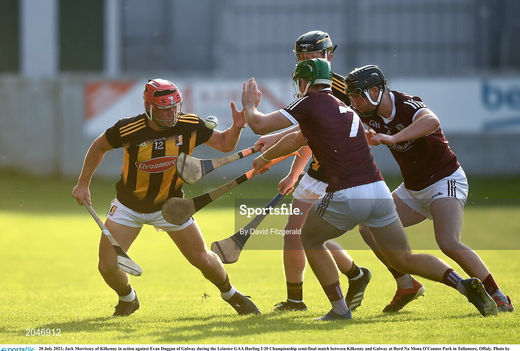 20 July 2021; Jack Morrissey of Kilkenny in action against Evan Duggan of Galway during the Leinster GAA Hurling U20 Championship semi-final match between Kilkenny and Galway at Bord Na Mona O'Connor Park in Tullamore, Offaly. Photo by David Fitzgerald/Sportsfile