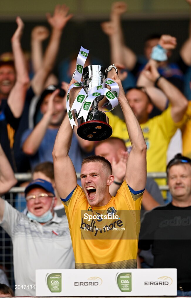 21 July 2021; Roscommon captain Colin Walsh lifts the cup after the EirGrid Connacht GAA Football U20 Championship Final match between Mayo and Roscommon at Elverys MacHale Park in Castlebar, Mayo. Photo by Piaras Ó Mídheach/Sportsfile