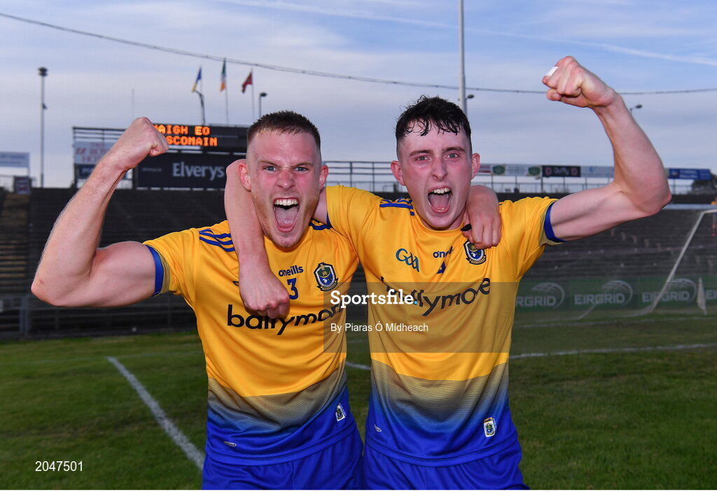21 July 2021; Roscommon players Colin Walsh, left, and Dylan Gaughan celebrate after their side's victory in the EirGrid Connacht GAA Football U20 Championship Final match between Mayo and Roscommon at Elverys MacHale Park in Castlebar, Mayo. Photo by Piaras Ó Mídheach/Sportsfile