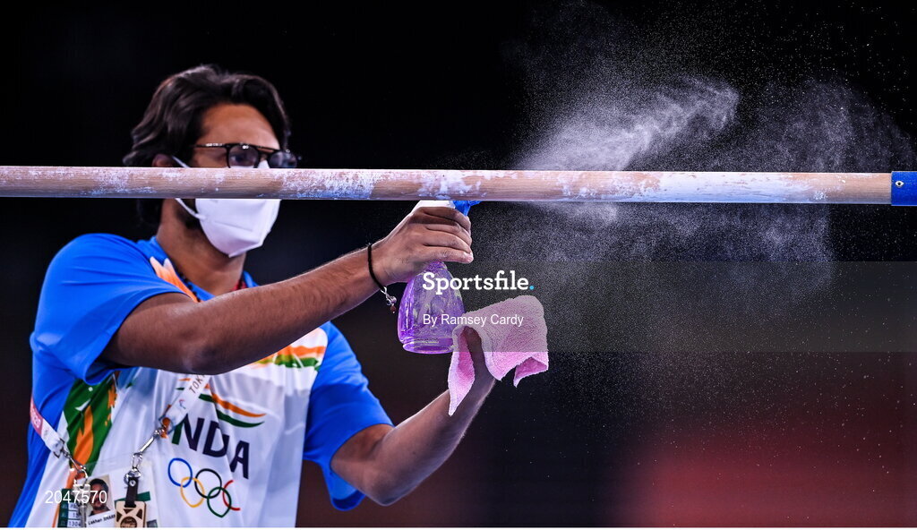 22 July 2021; India coach Lahkan Sharma sprays down the bars during a training session at the Ariake Gymnastics Arena ahead of the start of the 2020 Tokyo Summer Olympic Games in Tokyo, Japan. Photo by Ramsey Cardy/Sportsfile