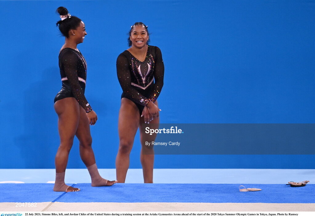 22 July 2021; Simone Biles, left, and Jordan Chiles of the United States during a training session at the Ariake Gymnastics Arena ahead of the start of the 2020 Tokyo Summer Olympic Games in Tokyo, Japan. Photo by Ramsey Cardy/Sportsfile