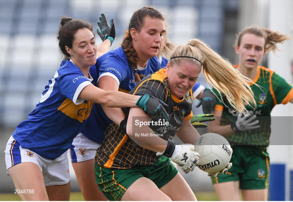 23 July 2021; Monica McGuirk of Meath in action against Cliona O'Dwyer and Caitlin Kennedy of Tipperary during the TG4 All-Ireland Senior Ladies Football Championship Group 2 Round 3 match between Meath and Tipperary at MW Hire O'Moore Park in Portlaoise, Co Laois. Photo by Matt Browne/Sportsfile *