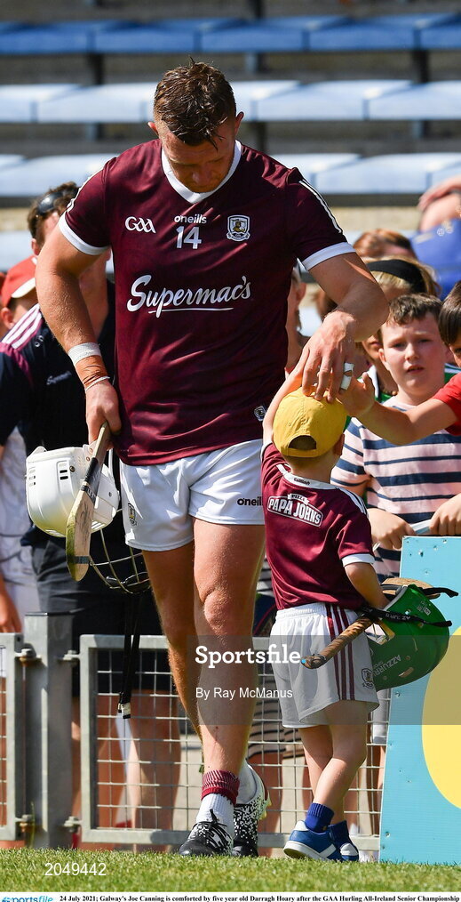 24 July 2021; Galway's Joe Canning is comforted by five year old Darragh Hoary after the GAA Hurling All-Ireland Senior Championship Round 2 match between Waterford and Galway at Semple Stadium in Thurles, Tipperary. Photo by Ray McManus/Sportsfile
