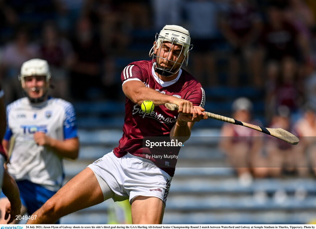 24 July 2021; Jason Flynn of Galway shoots to score his side's third goal during the GAA Hurling All-Ireland Senior Championship Round 2 match between Waterford and Galway at Semple Stadium in Thurles, Tipperary. Photo by Harry Murphy/Sportsfile