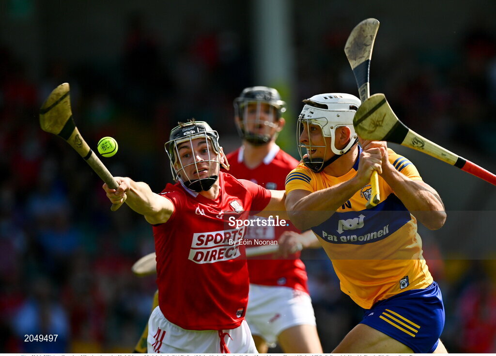 23 July 2021; Aron Shanagher of Clare in action against Mark Coleman of Cork during the GAA Hurling All-Ireland Senior Championship Round 2 match between Clare and Cork at LIT Gaelic Grounds in Limerick. Photo by Eóin Noonan/Sportsfile