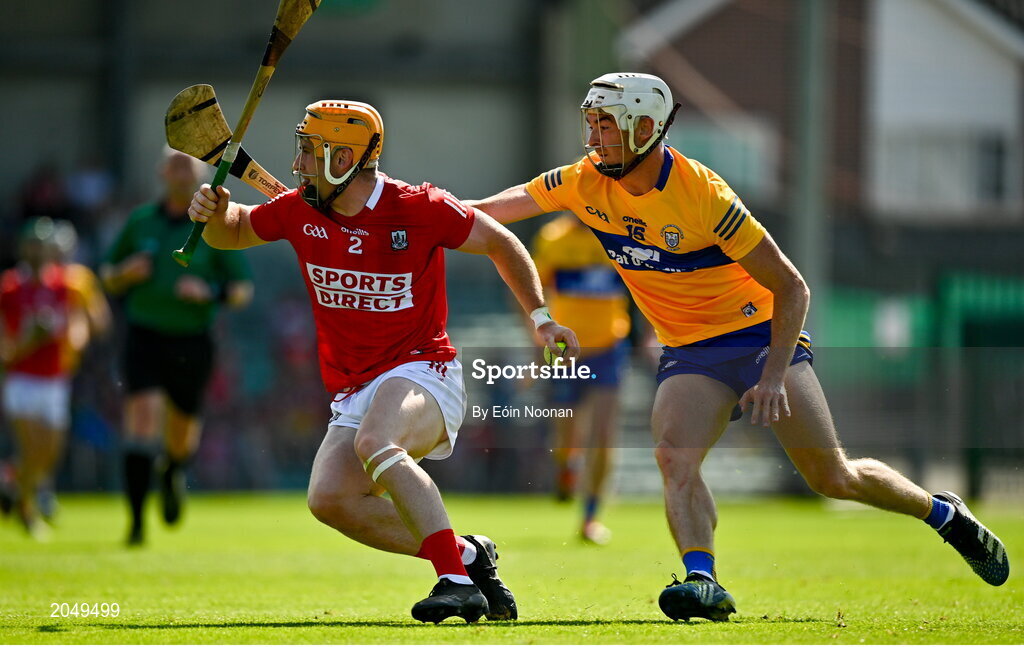 23 July 2021; Niall O'Leary of Cork in action against Ryan Taylor of Clare during the GAA Hurling All-Ireland Senior Championship Round 2 match between Clare and Cork at LIT Gaelic Grounds in Limerick. Photo by Eóin Noonan/Sportsfile