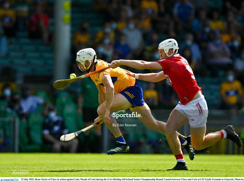 23 July 2021; Ryan Taylor of Clare in action against Luke Meade of Cork during the GAA Hurling All-Ireland Senior Championship Round 2 match between Clare and Cork at LIT Gaelic Grounds in Limerick. Photo by Eóin Noonan/Sportsfile