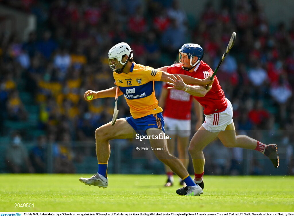 23 July 2021; Aidan McCarthy of Clare in action against Seán O'Donoghue of Cork during the GAA Hurling All-Ireland Senior Championship Round 2 match between Clare and Cork at LIT Gaelic Grounds in Limerick. Photo by Eóin Noonan/Sportsfile