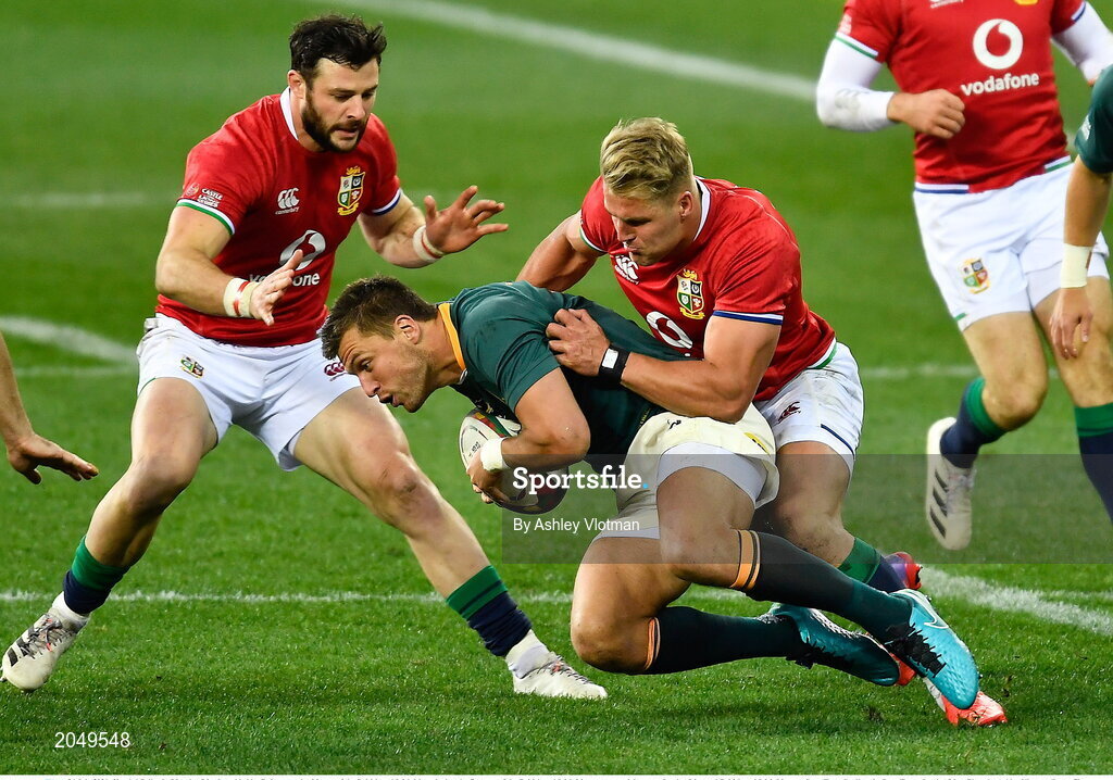 24 July 2021; Handré Pollard of South Africa is tackled by Duhan van der Merwe of the British and Irish Lions during the first test of the British and Irish Lions tour match between South Africa and British and Irish Lions at Cape Town Stadium in Cape Town, South Africa. Photo by Ashley Vlotman/Sportsfile