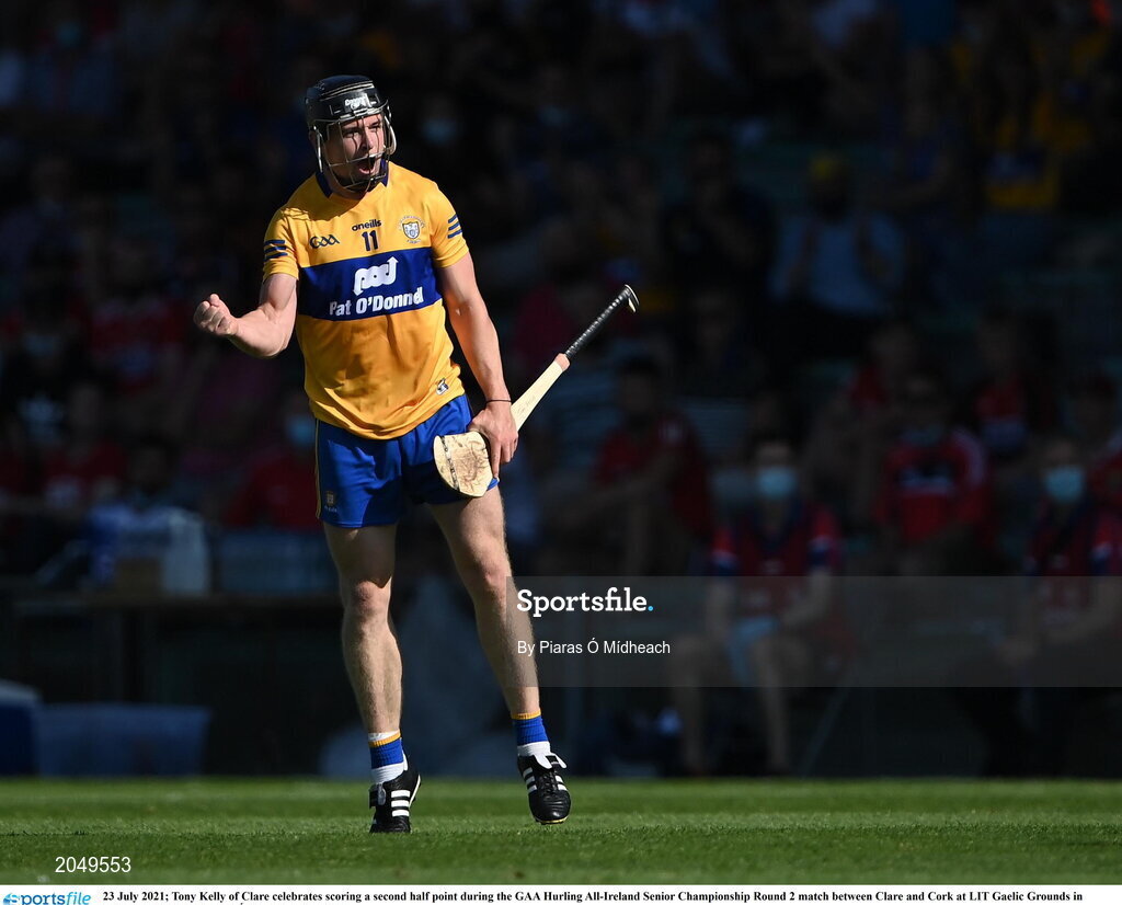 23 July 2021; Tony Kelly of Clare celebrates scoring a second half point during the GAA Hurling All-Ireland Senior Championship Round 2 match between Clare and Cork at LIT Gaelic Grounds in Limerick. Photo by Piaras Ó Mídheach/Sportsfile