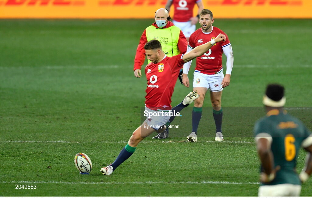 24 July 2021; Elliot Daly looks on as team-mate Dan Biggar of the British and Irish Lions kicks a penalty during the first test of the British and Irish Lions tour match between South Africa and British and Irish Lions at Cape Town Stadium in Cape Town, South Africa. Photo by Ashley Vlotman/Sportsfile