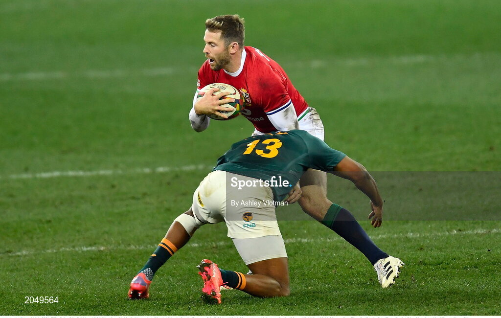 24 July 2021; Elliot Daly of the British and Irish Lions is tackled by Lukhanyo Am of South Africa during the first test of the British and Irish Lions tour match between South Africa and British and Irish Lions at Cape Town Stadium in Cape Town, South Africa. Photo by Ashley Vlotman/Sportsfile