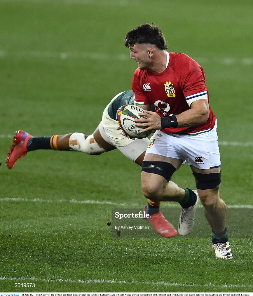 24 July 2021; Tom Curry of the British and Irish Lions evades the tackle of Lukhanyo Am of South Africa during the first test of the British and Irish Lions tour match between South Africa and British and Irish Lions at Cape Town Stadium in Cape Town, South Africa. Photo by Ashley Vlotman/Sportsfile