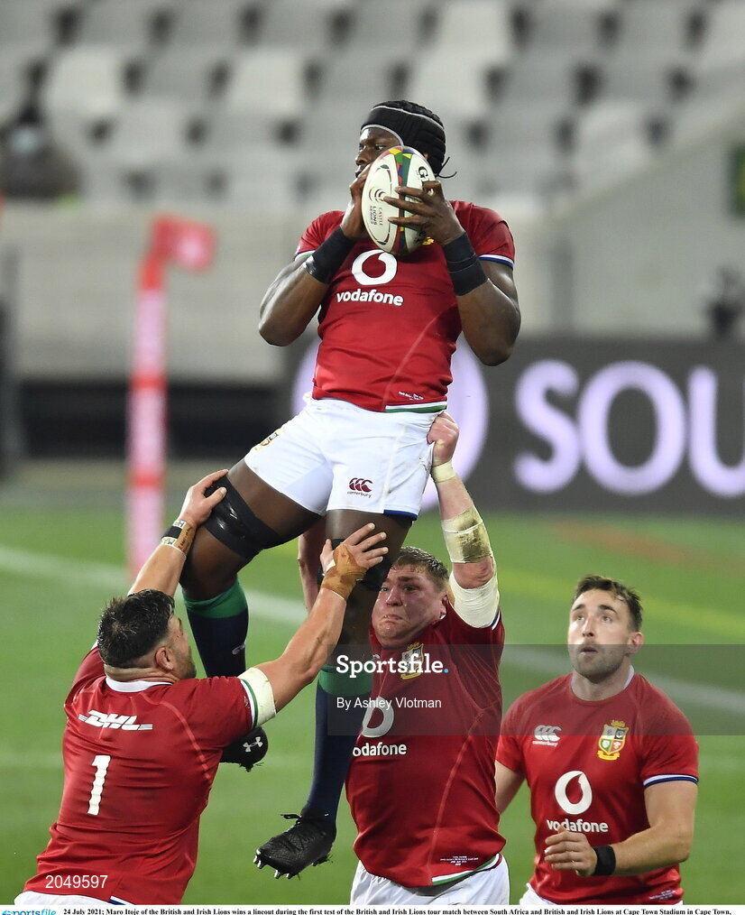 24 July 2021; Maro Itoje of the British and Irish Lions wins a lineout during the first test of the British and Irish Lions tour match between South Africa and British and Irish Lions at Cape Town Stadium in Cape Town, South Africa. Photo by Ashley Vlotman/Sportsfile