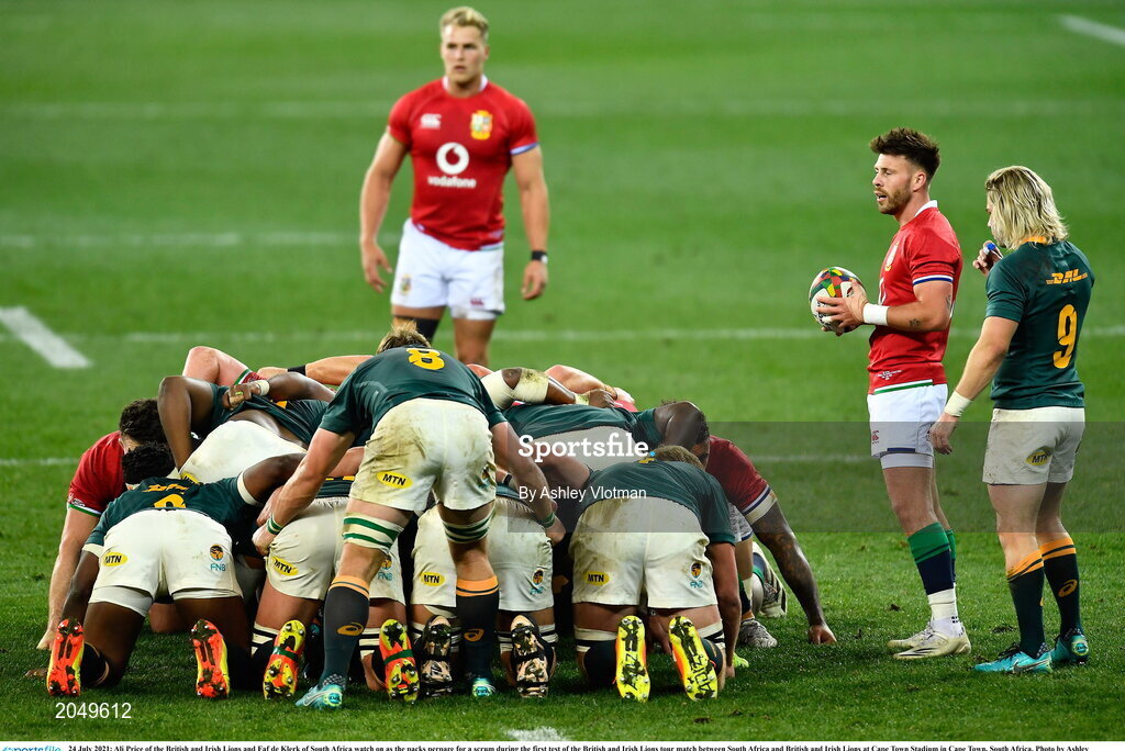 24 July 2021; Ali Price of the British and Irish Lions and Faf de Klerk of South Africa watch on as the packs perpare for a scrum during the first test of the British and Irish Lions tour match between South Africa and British and Irish Lions at Cape Town Stadium in Cape Town, South Africa. Photo by Ashley Vlotman/Sportsfile