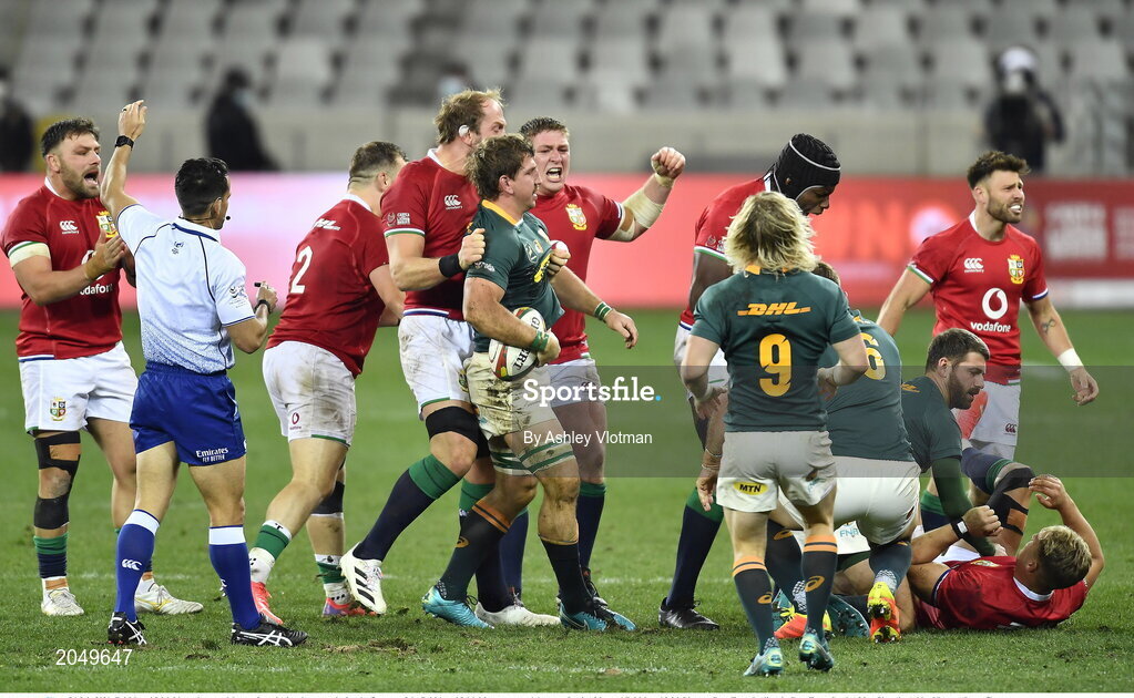 24 July 2021; British and Irish Lions players celebrate after winning the scrum during the first test of the British and Irish Lions tour match between South Africa and British and Irish Lions at Cape Town Stadium in Cape Town, South Africa. Photo by Ashley Vlotman/Sportsfile