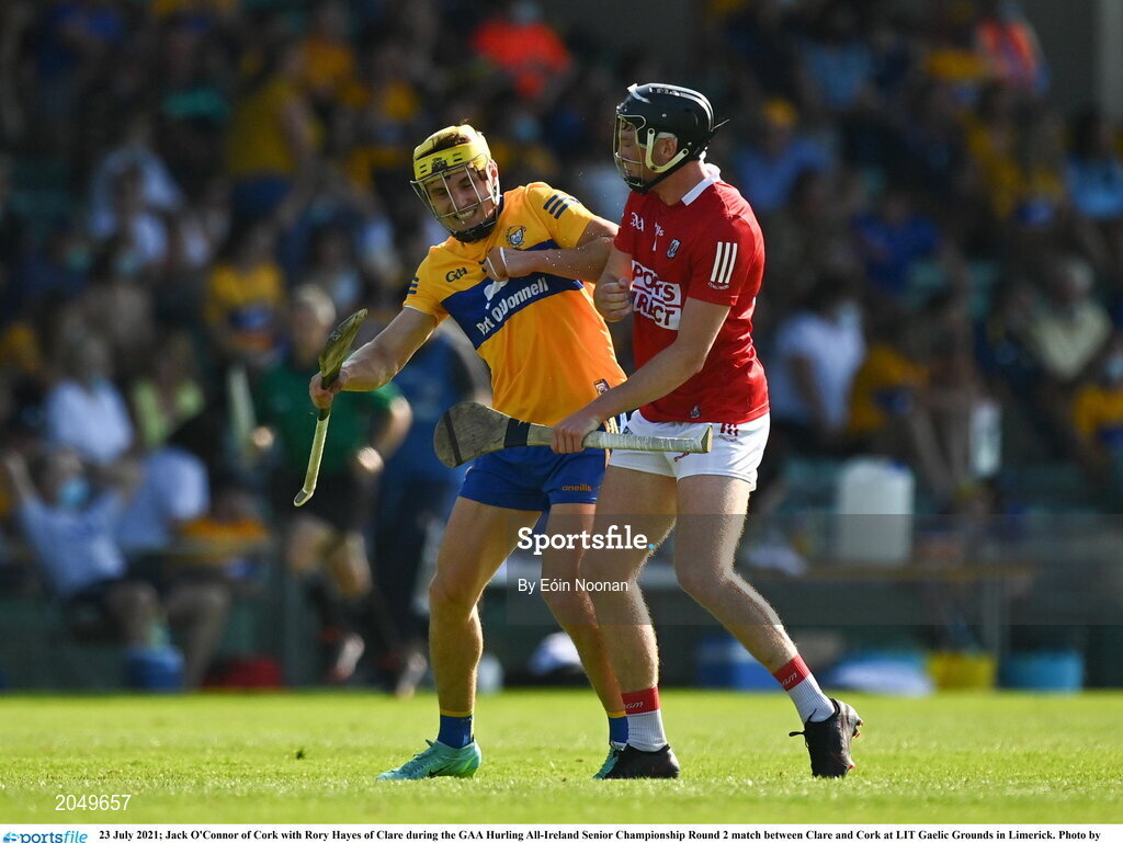 23 July 2021; Jack O'Connor of Cork with Rory Hayes of Clare during the GAA Hurling All-Ireland Senior Championship Round 2 match between Clare and Cork at LIT Gaelic Grounds in Limerick. Photo by Eóin Noonan/Sportsfile