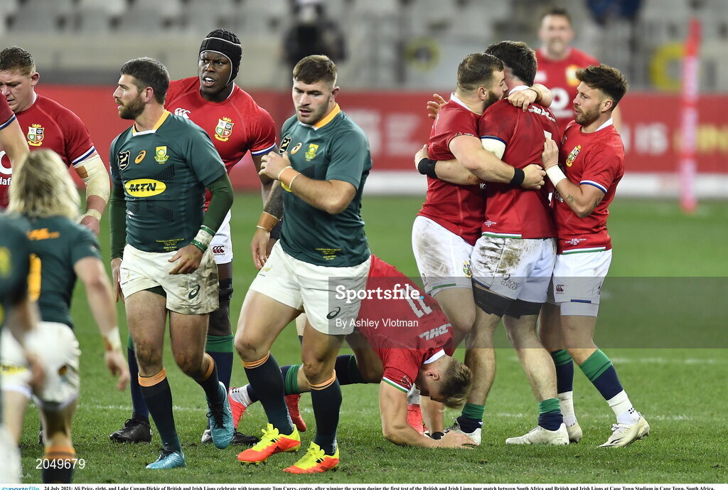 24 July 2021; Ali Price, right, and Luke Cowan-Dickie of British and Irish Lions celebrate with team-mate Tom Curry, centre, after winning the scrum during the first test of the British and Irish Lions tour match between South Africa and British and Irish Lions at Cape Town Stadium in Cape Town, South Africa. Photo by Ashley Vlotman/Sportsfile