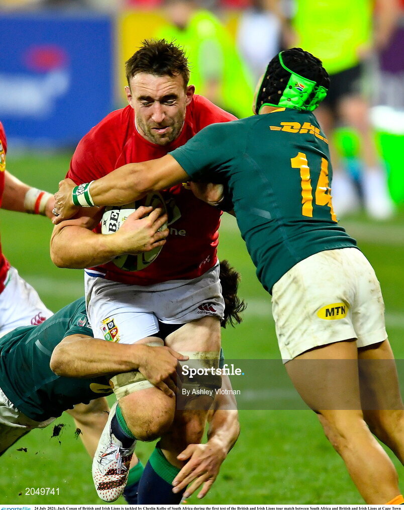 24 July 2021; Jack Conan of British and Irish Lions is tackled by Cheslin Kolbe of South Africa during the first test of the British and Irish Lions tour match between South Africa and British and Irish Lions at Cape Town Stadium in Cape Town, South Africa. Photo by Ashley Vlotman/Sportsfile