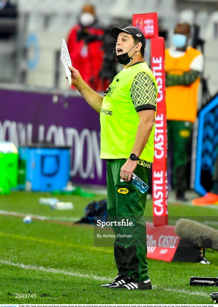 24 July 2021; South Africa head coach Rassie Erasmus during the first test of the British and Irish Lions tour match between South Africa and British and Irish Lions at Cape Town Stadium in Cape Town, South Africa. Photo by Ashley Vlotman/Sportsfile