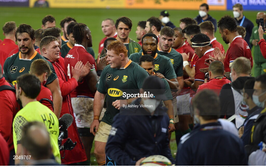 24 July 2021; British and Irish Lions players applaud the South Africa players who they defeated in the first test of the British and Irish Lions tour match between South Africa and British and Irish Lions at Cape Town Stadium in Cape Town, South Africa. Photo by Ashley Vlotman/Sportsfile