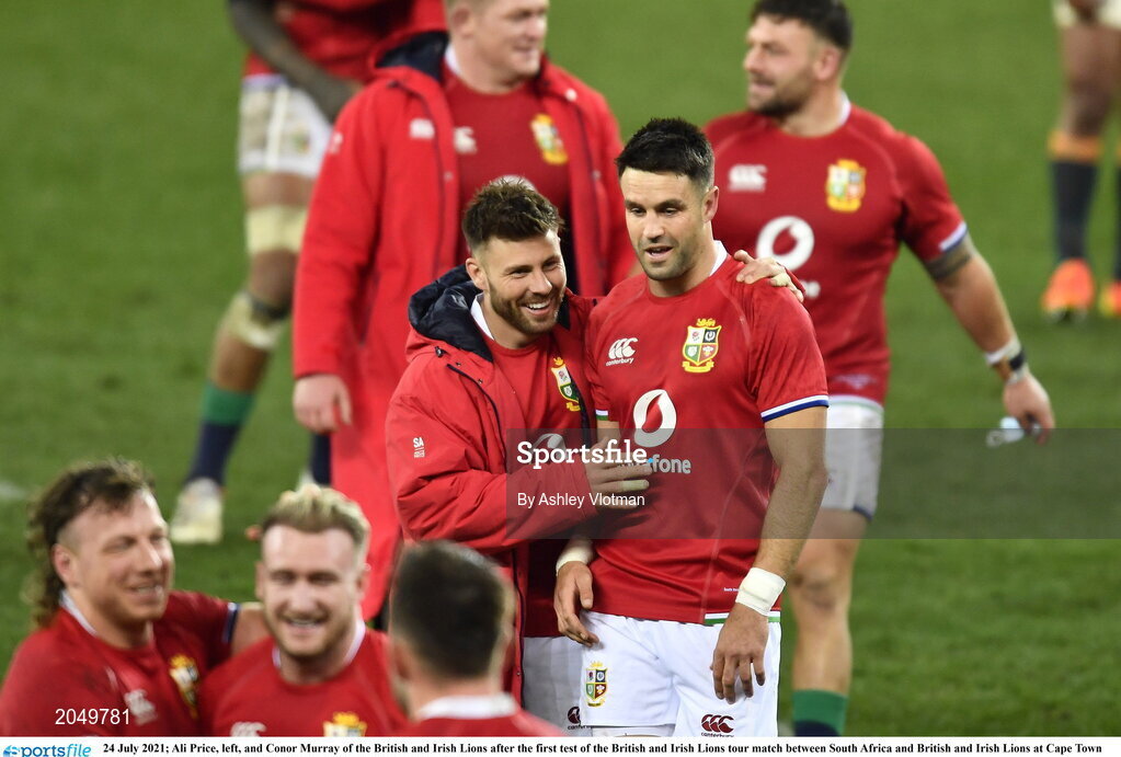 24 July 2021; Ali Price, left, and Conor Murray of the British and Irish Lions after the first test of the British and Irish Lions tour match between South Africa and British and Irish Lions at Cape Town Stadium in Cape Town, South Africa. Photo by Ashley Vlotman/Sportsfile