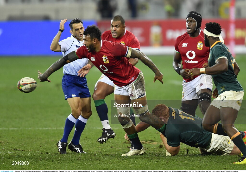 24 July 2021; Courtney Lawes of the British and Irish Lions offloads the ball as Steven Kitshoff of South Africa attempts a tackle during the first test of the British and Irish Lions tour match between South Africa and British and Irish Lions at Cape Town Stadium in Cape Town, South Africa. Photo by Ashley Vlotman/Sportsfile