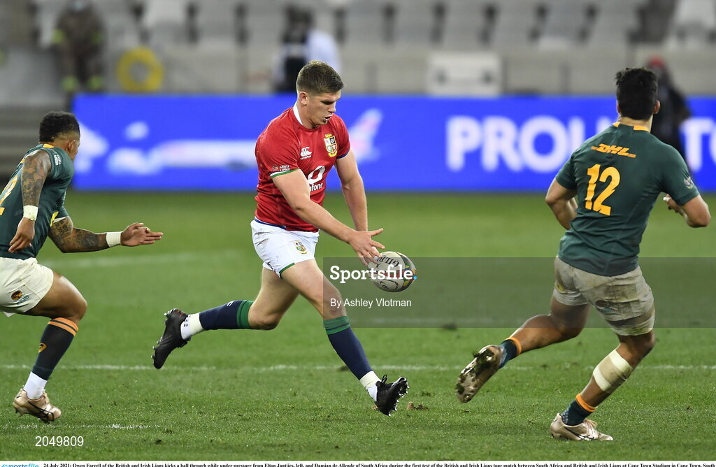 24 July 2021; Owen Farrell of the British and Irish Lions kicks a ball through while under pressure from Elton Jantjies, left, and Damian de Allende of South Africa during the first test of the British and Irish Lions tour match between South Africa and British and Irish Lions at Cape Town Stadium in Cape Town, South Africa. Photo by Ashley Vlotman/Sportsfile