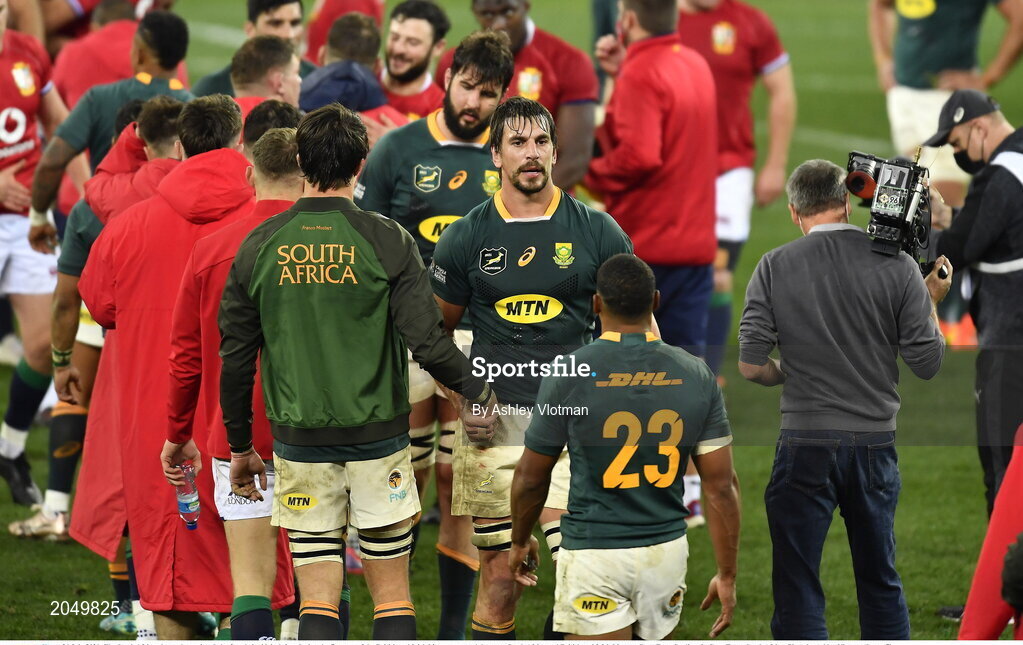 24 July 2021; The South Africa players leave the pitch after their side's defeat during the first test of the British and Irish Lions tour match between South Africa and British and Irish Lions at Cape Town Stadium in Cape Town, South Africa. Photo by Ashley Vlotman/Sportsfile