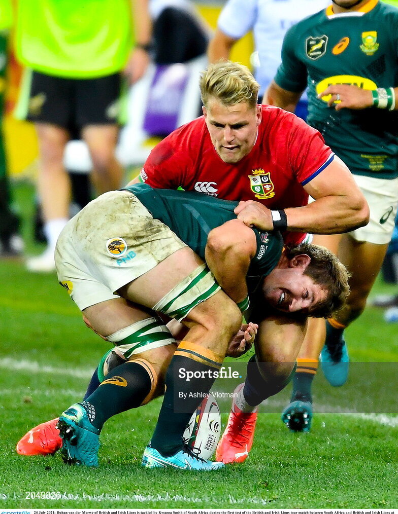 24 July 2021; Duhan van der Merwe of British and Irish Lions is tackled by Kwagga Smith of South Africa during the first test of the British and Irish Lions tour match between South Africa and British and Irish Lions at Cape Town Stadium in Cape Town, South Africa. Photo by Ashley Vlotman/Sportsfile