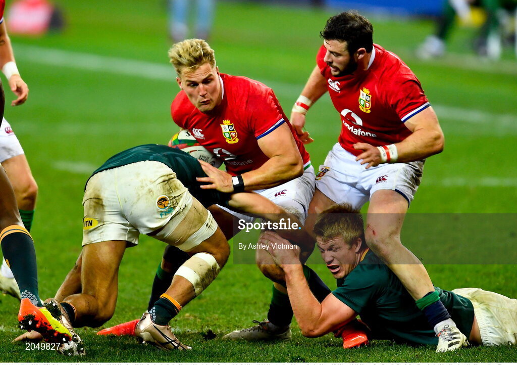 24 July 2021; Duhan van der Merwe of British and Irish Lions is tackled by Damian de Allende of South Africa during the first test of the British and Irish Lions tour match between South Africa and British and Irish Lions at Cape Town Stadium in Cape Town, South Africa. Photo by Ashley Vlotman/Sportsfile