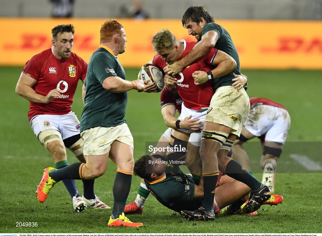 24 July 2021; Jack Conan comes to the assistance of his team-mate Duhan van der Merwe of British and Irish Lions after he is tackled by Eben Etzebeth of South Africa his during the first test of the British and Irish Lions tour match between South Africa and British and Irish Lions at Cape Town Stadium in Cape Town, South Africa. Photo by Ashley Vlotman/Sportsfile