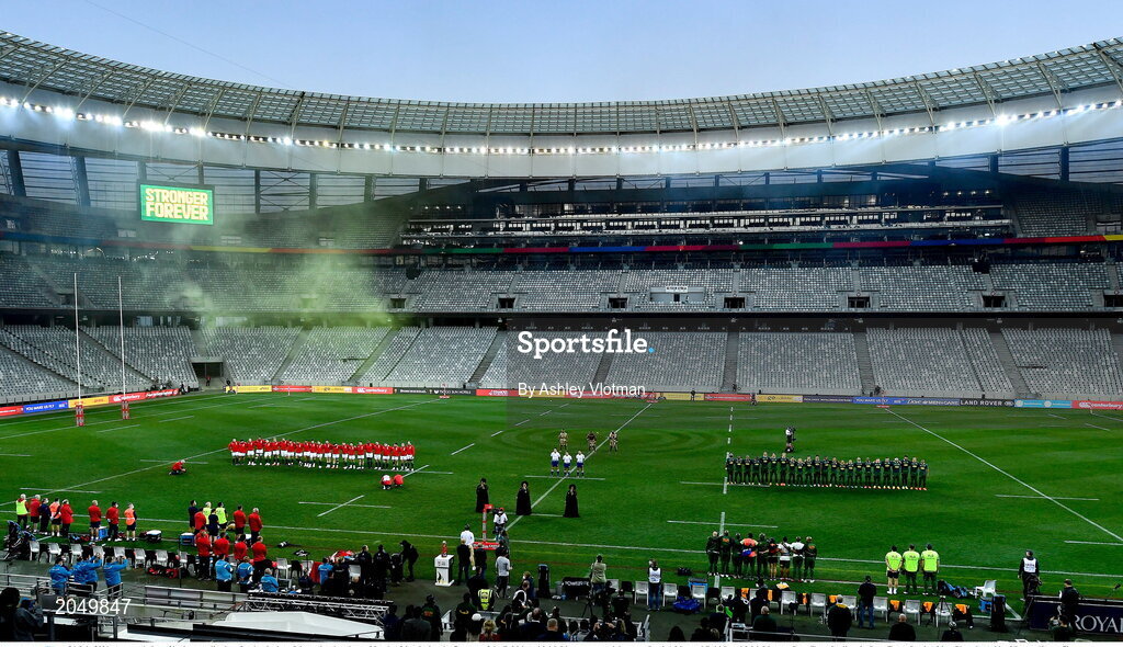 24 July 2021; A general view of both teams lined up for the singing of the national anthem of South Africa during the first test of the British and Irish Lions tour match between South Africa and British and Irish Lions at Cape Town Stadium in Cape Town, South Africa. Photo by Ashley Vlotman/Sportsfile