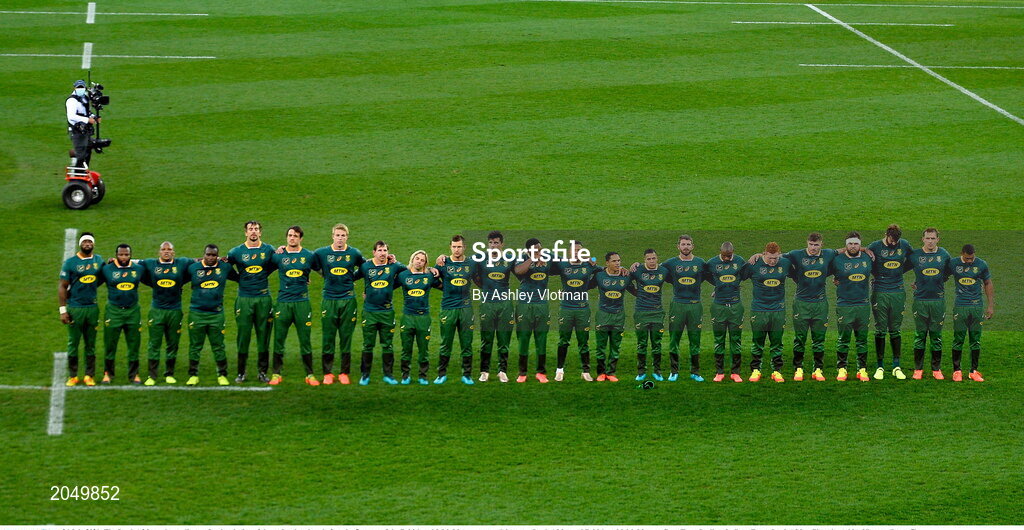 24 July 2021; The South African players line-up for the playing of the national anthem before the first test of the British and Irish Lions tour match between South Africa and British and Irish Lions at Cape Town Stadium in Cape Town, South Africa. Photo by Ashley Vlotman/Sportsfile