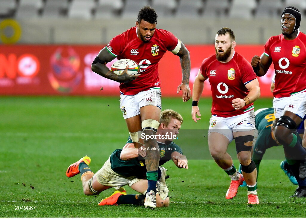 24 July 2021; Courtney Lawes of British and Irish Lions evades the tackle of Pieter Steph du Toit of South Africa during the first test of the British and Irish Lions tour match between South Africa and British and Irish Lions at Cape Town Stadium in Cape Town, South Africa. Photo by Ashley Vlotman/Sportsfile