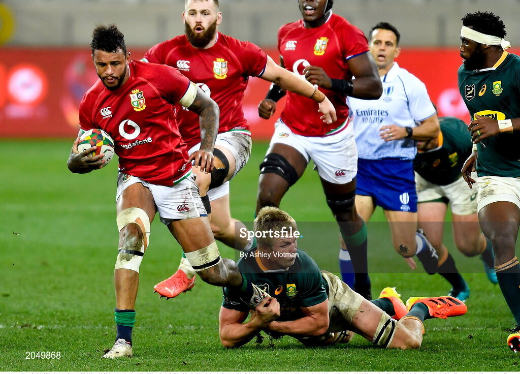 24 July 2021; Courtney Lawes of British and Irish Lions evades the tackle of Pieter Steph du Toit of South Africa during the first test of the British and Irish Lions tour match between South Africa and British and Irish Lions at Cape Town Stadium in Cape Town, South Africa. Photo by Ashley Vlotman/Sportsfile
