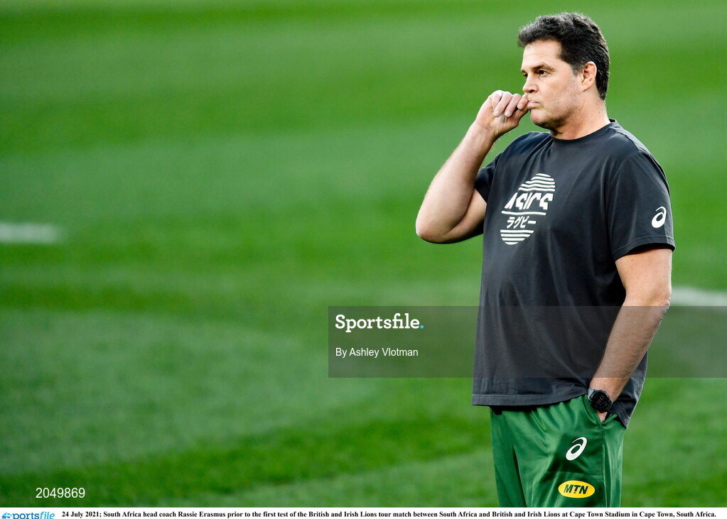 24 July 2021; South Africa head coach Rassie Erasmus prior to the first test of the British and Irish Lions tour match between South Africa and British and Irish Lions at Cape Town Stadium in Cape Town, South Africa. Photo by Ashley Vlotman/Sportsfile